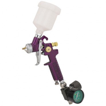 Lightweight spray gun ideal for covering small areas and touch-up work The HVLP paint gun provides a higher proportion of paint reaching the target surface with less overspray compared to conventional spray guns. This paint gun features a 5.3 ounce gravity feed cup, an adjustable regulator and interchangeable nozzles that allows you to shoot any type of paint.?Stainless steel nozzle and needle?5.3 oz. gravity feed cup?Shoot any type of paint?Air inlet: 1/4''Minimum transfer efficiency: 65% Operating air pressure: 43 PSI Air consumption: 3.7 CFM Air inlet: 1/4'' Fluid nozzle: 1mm (.039") Flow rate: 40cc per minute Cap pressure: 10 PSI Overall dimensions: 12-3/4'' x 6-1/8'' x 3-7/8'' Weight: 1.48 lbs.