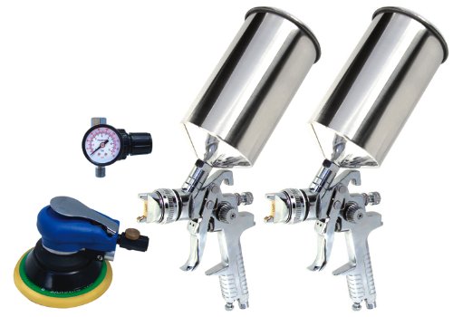 Vaper 19223 HVLP Dual Setup Spray Gun Kit - 4 Piece includes: gun A - 1.4 millimeter production gun. Gun B - 1.7 millimeter production gun. It has a locking pressure regulator with gauge. It has a 6 inch random orbital sander for paint prep and finishing applications. It has mesh filters for gravity feed paint cups. It has 2 spray gun wrenches and a cleaning brush.
